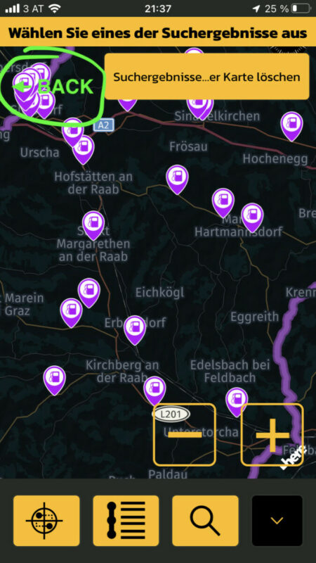 So could you include a "Back" button when the search results are displayed on the map? And even better a button to restart the search if one moves around the map, so you get the gas stations for that area without having to start allover again.