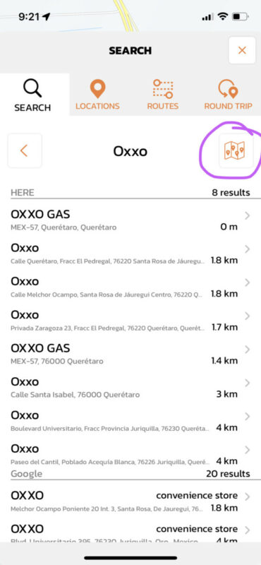 When I press it, all of the search results are shown on the map, which is great! But after that, I can't get back to the results page where I can see the distances.