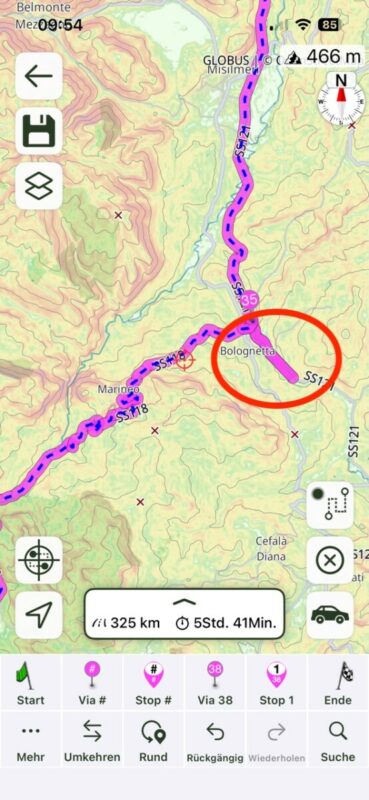 Try moving via 35 (tap on it and choose move) away from the junction. If that doesn’t work, start removing via points around this point. If the pink route stays the same after removing a via, you don’t need that via point.