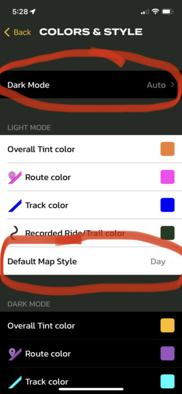 I did see that, unfortunately Dark Mode overrides the Default Map Style. I want the app theme to be Dark Mode for the menus and such, but the map style to be Day so the map is bright when riding. However the map style is defaulting to Night despite the Day setting