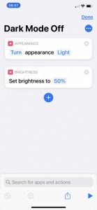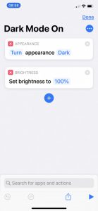 On your iPhone search the library for Shortcuts. This is a built in Apple app. Select the '+' icon top right to create a new shortcut. Tap 'Add Action' then search 'Dark' and select 'Set Appearance'. The default action will read 'Turn appearance Dark'. You can change Dark to Light by tapping on the blue word 'Dark' and selecting from popup menu. To finish shortcut and save tap on 'Next' top right. Give the shortcut a name. You will now see your newly created shortcut in the main shortcut app menu. Test it by selecting it. You can edit the shortcut by tapping on the '3 dots' top right in shortcut button. To add this to Scenic goto 'Settings' page. Select 'Navigation Menu' and then give 'Shortcut 1' or 'Shortcut 2' the EXACT name you gave your shortcut. The name of the shortcut must be the same otherwise it will not work. Be very careful with spaces between names. Thats it.