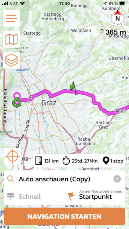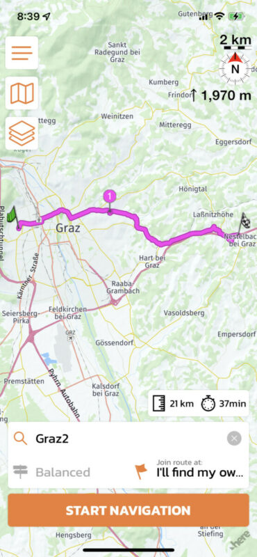 Quote from Guido on 18.01.2022, 15:33OK. Getting a bit different results when I also download the offline map. With the offline map, indeed, the route seems to be consistent between the power planner and the start/map screen. Also when I start the navigation at first the route is the same (mind you, I have to simulate this as I'm not in Graz neighborhood). However, when I then go into edit mode while navigating (double tap the map) and then remove my start flag (so only via 1 and end flag remain), the route becomes different.