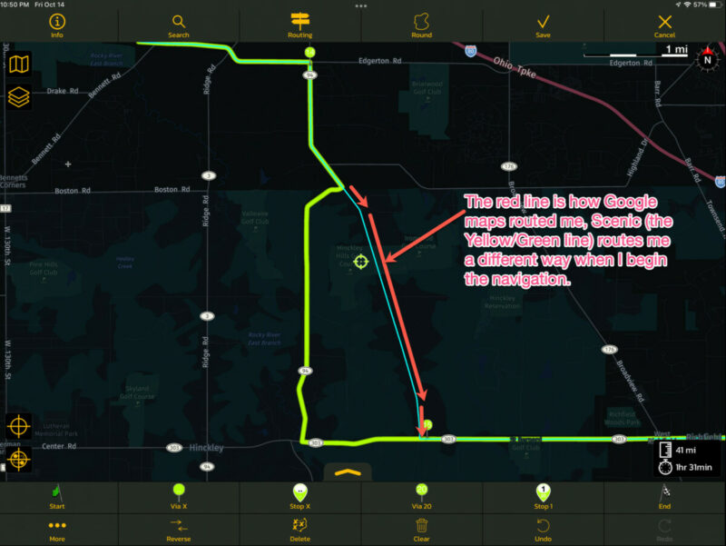 I was expecting after import, starting the navigation would not changes anything. Maybe I'm missing a configuration item to tell Scenic to follow the route from the imported GPX file verbatim? I admit I have not read the manual completely, but plan on doing this this winter (non-riding) season that's heading our way quickly here in the northern USA.