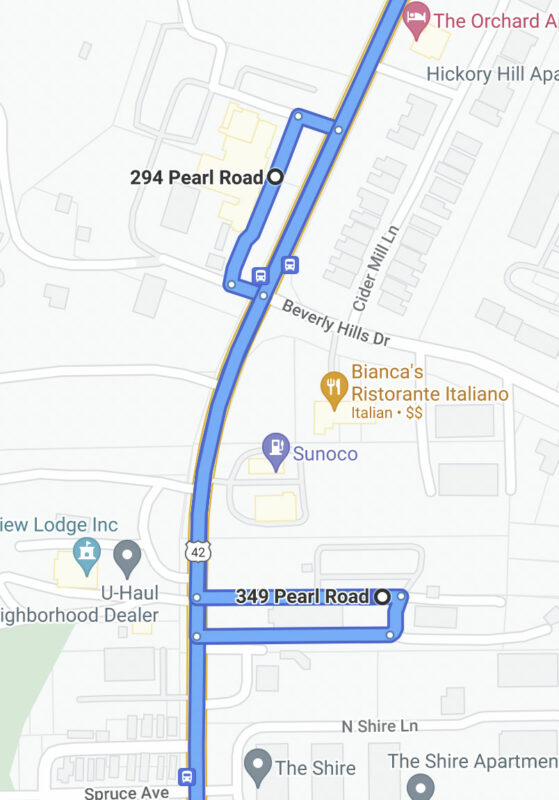 According to the left hand pane, it seems you visit 294 pearl road before 349 pearl road. If that's intentional never mind, but if not, try going to 349 first. Now there's a loop sending you up and down.