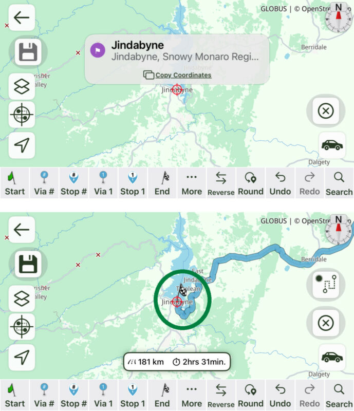 However, with the Android version (landscape only) when I search for a destination the 'locating' circle appears to be centered both vertically and horizontally in the screen (circled in green) instead of on the destination (circled in black behind the route info bar) which means I have to use my fingers to manually zoom in to the destination so that I can set it as the 'end' point (and save the route).