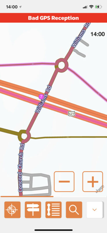 Plan route in google, copy url and import into scentic webapp and then in iPhone app. It looks perfect in review, route goes through the circle and out the other side to keep going straight. Now, when I start navigation, things go awry. First I noticed that the time estimate to destination is way off. Once I approach this traffic cirle I see why. It has me exiting on the 2nd exit, which in this case ends up being the interstate on ramp. I can see the planned track go that way, and seemingly must turn around at some point and come back as I ALSO see the track go out the correct exit of the traffic circle. Yikes!