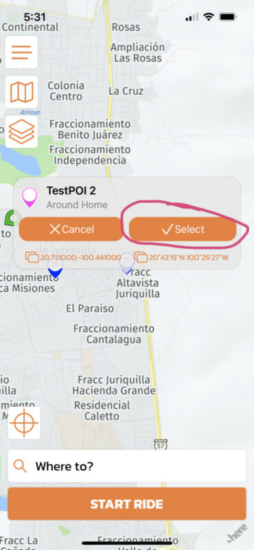 Example in the ‘map’ screen, tap the marker and choose ‘select’ to add it as a stop or destination: