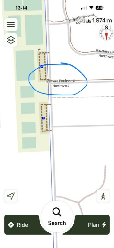 The first one is a map data issue. Scenic uses OpenStreetMap (OSM) as its data source. According to OSM, this street it called Bellaire Boulevard Northwest from the start, while in reality (according to Google Maps), it's Eagle street, which later becomes Bellaire Boulevard Northwest. Map data issues are unfortunately out of our control. If you want you can report, or even fix these issues: https://scenic.app/help/reporting-map-errors/
