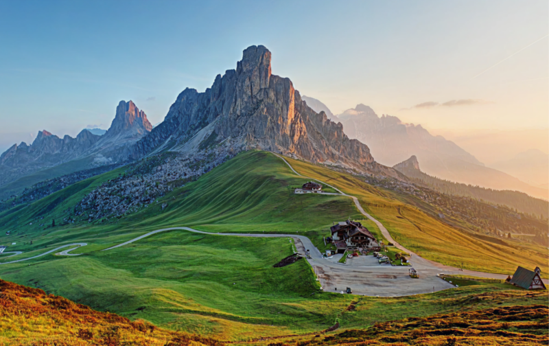 At the summit of Passo Giau, the Rifugio Passo Giau serves coffee with a view of the Nuvolau massif that alone justifies the ride. From the rifugio terrace, looking north, the entire amphitheatre of Dolomite peaks is laid out in front of you. Go before 9 AM for the best light and empty tables.